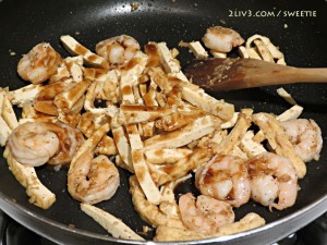 - Trộn chung tôm, đậu phụ đã được xào chín vào lại chảo mì.
