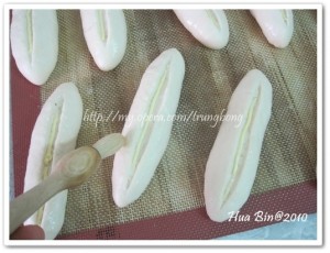 H13: Chia bột thành 6 hoặc 9 hoặc 10 phần tùy thích. Để nghỉ 5- 10 phút. H14. Cán bột phẳng ra, cán bột có tác dụng làm xẹp bọt khí, và dàn đều phần bột. H15: Cuộn bột lại, cảm quan bột dẻo dính tay. H16:tạo hình bánh thuôn