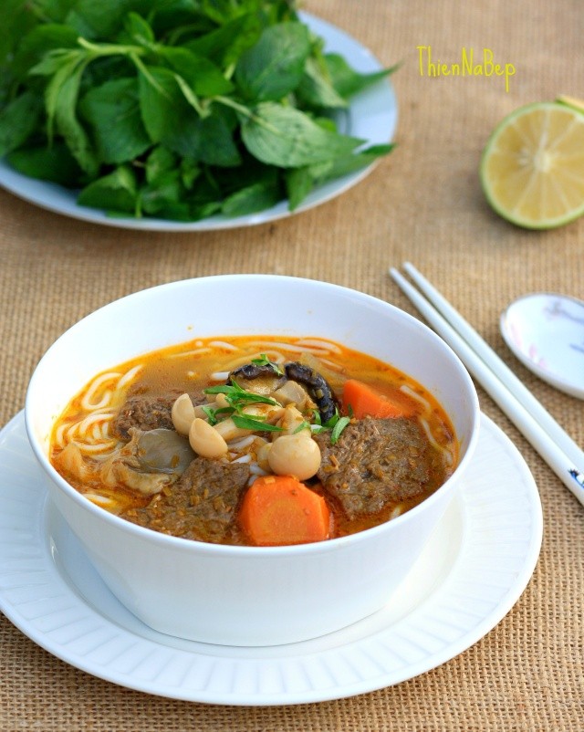 Khi ăn cho bún ra tô múc các loại rau củ, nấm và thịt bò khô vào tô chan nước lèo , như vậy bạn đã có 1 tô bún Huế thơm ngon đậm đặc mùi xả thơm thơm hương vị của tương cự đà, mùi vị không khác gì một tô bún bò huế bạn thường ăn.
