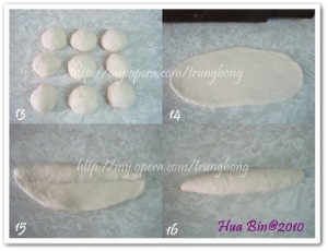 H13: Chia bột thành 6 hoặc 9 hoặc 10 phần tùy thích. Để nghỉ 5- 10 phút. H14. Cán bột phẳng ra, cán bột có tác dụng làm xẹp bọt khí, và dàn đều phần bột. H15: Cuộn bột lại, cảm quan bột dẻo dính tay. H16:tạo hình bánh thuôn