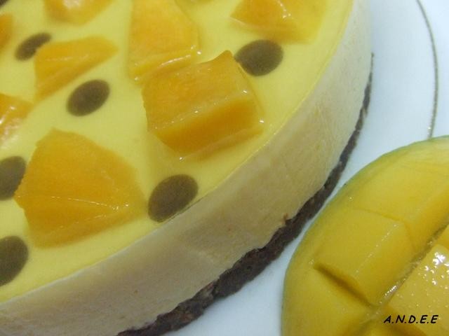 _ Phần mousse sau khi đông lấy ra, cắt xoài xếp lên rồi đổ hh gelatine lên, cho vào tủ lạnh đến khi đông thì róc bánh ra khỏi khuôn. Hoặc ko cắt xoài xếp lên thì đổ lớp top lên, cho vào tủ lạnh đến khi đông thì xếp trái cây và socola lên mặt bánh