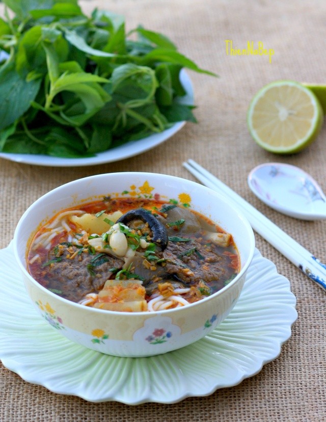 Khi ăn cho bún ra tô múc các loại rau củ, nấm và thịt bò khô vào tô chan nước lèo , như vậy bạn đã có 1 tô bún Huế thơm ngon đậm đặc mùi xả thơm thơm hương vị của tương cự đà, mùi vị không khác gì một tô bún bò huế bạn thường ăn.